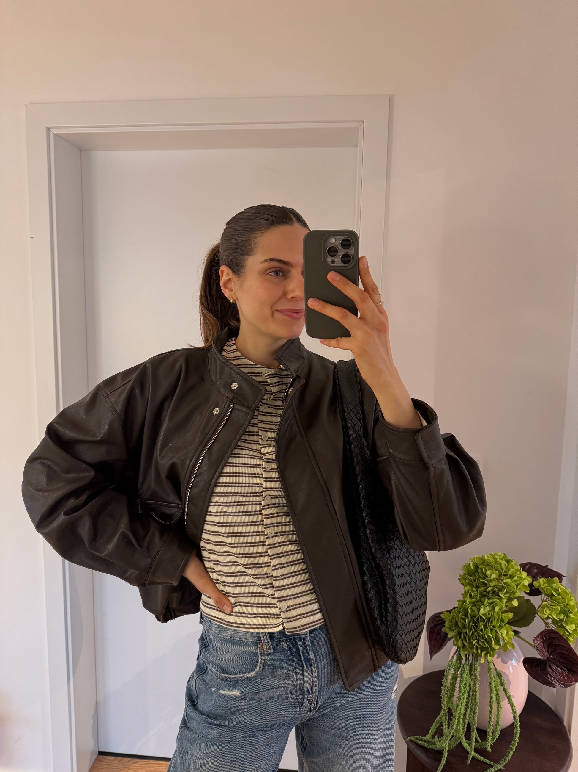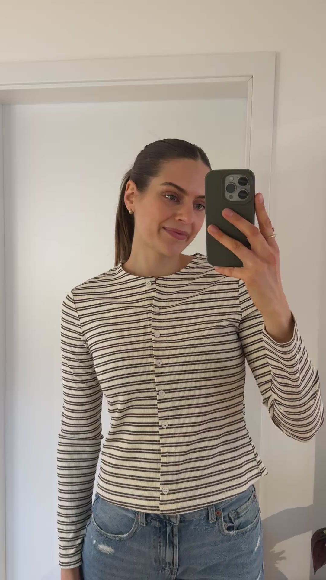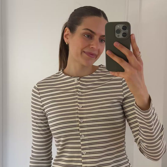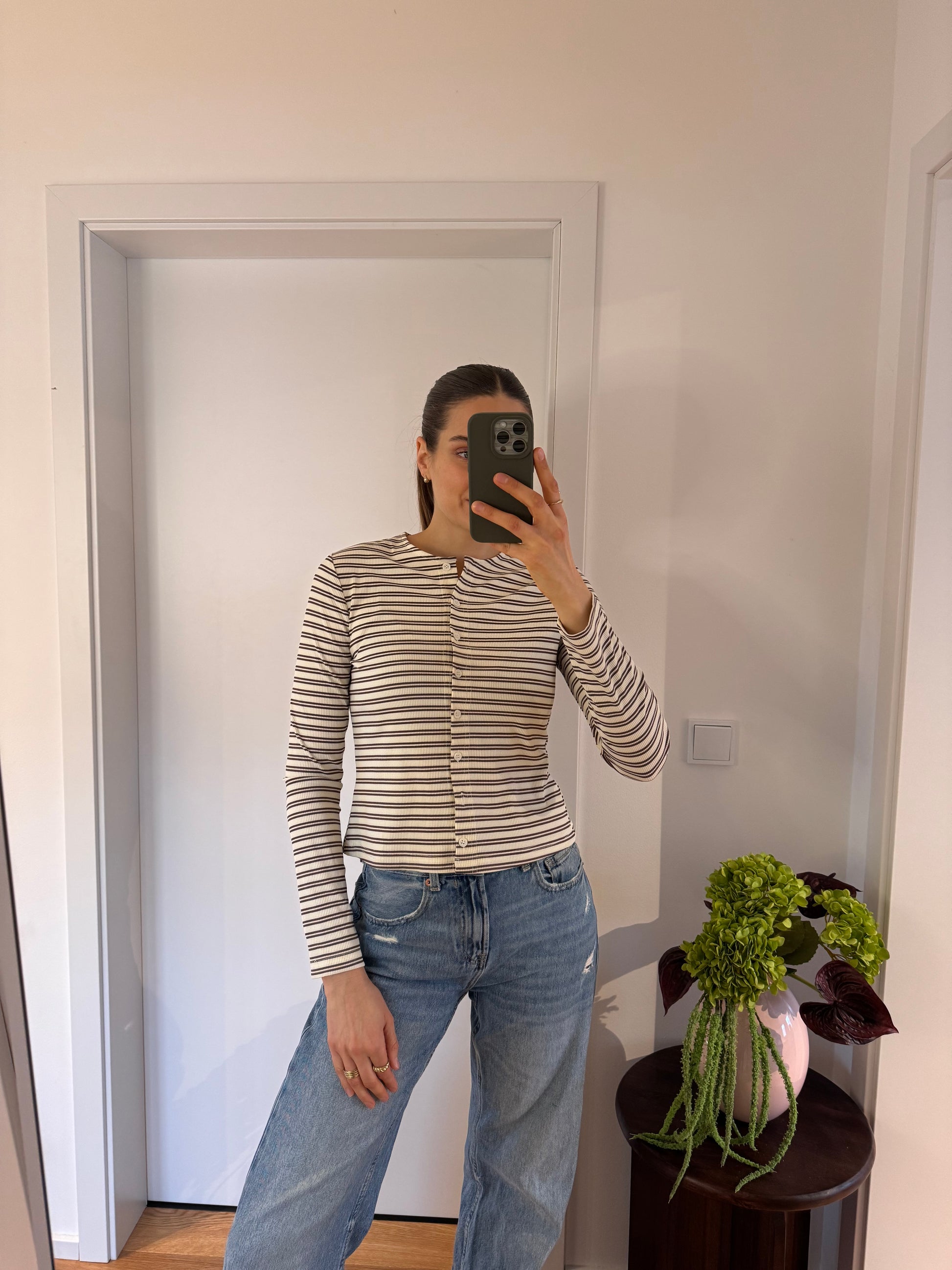 Passform: Lara ist 175 groß und trägt Gr.M, Oberteil hat eine Knopfleiste